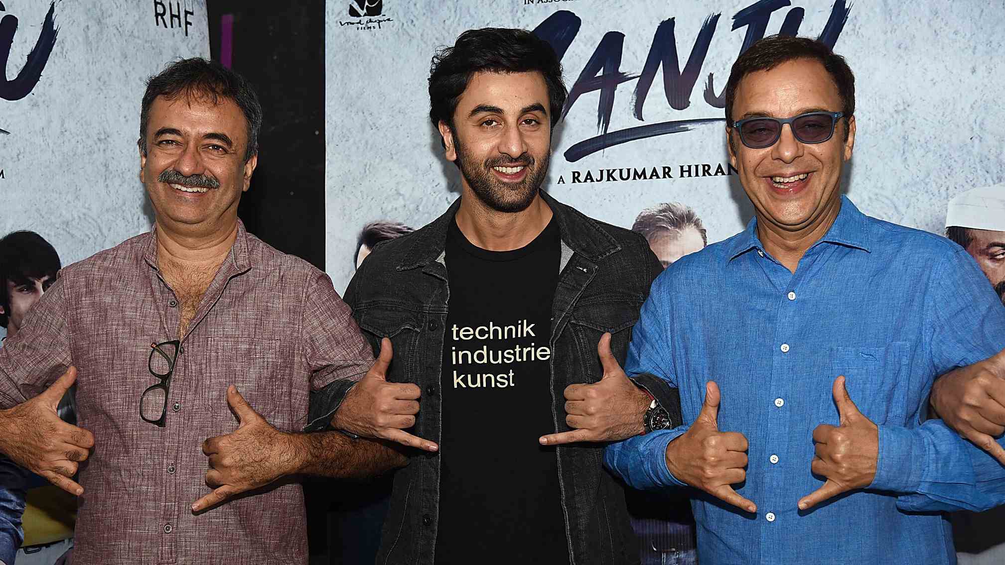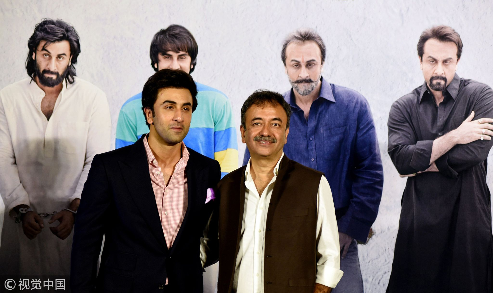 Indian Bollywood actor Ranbir Kapoor (L) poses for a picture with film Director Rajkumar Hirani during the teaser launch of his upcoming Indian biographical drama Hindi film 'Sanju,' based on the life of Bollywood actor Sanjay Dutt, in Mumbai on April 24, 2018. /VCG Photo