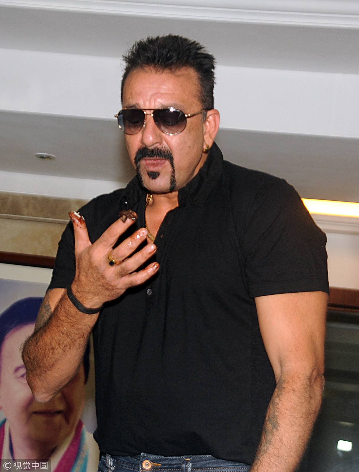Indian Bollywood actor Sanjay Dutt gestures during the celebration of his 57th birthday at his residence in Mumbai on July 29, 2016. /VCG Photo