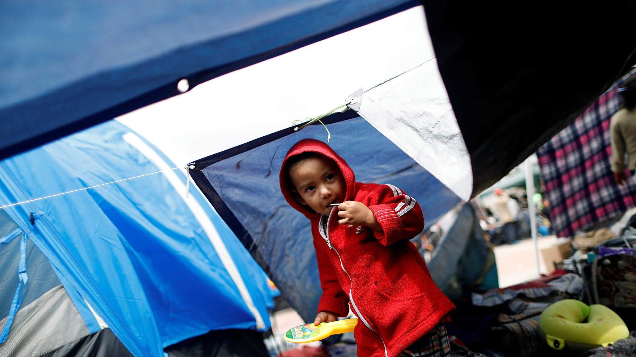 Children traveling with a caravan of migrants from Central America play at a camp near the San Ysidro checkpoint in Tijuana, Mexico, May 2, 2018. /VCG Photo