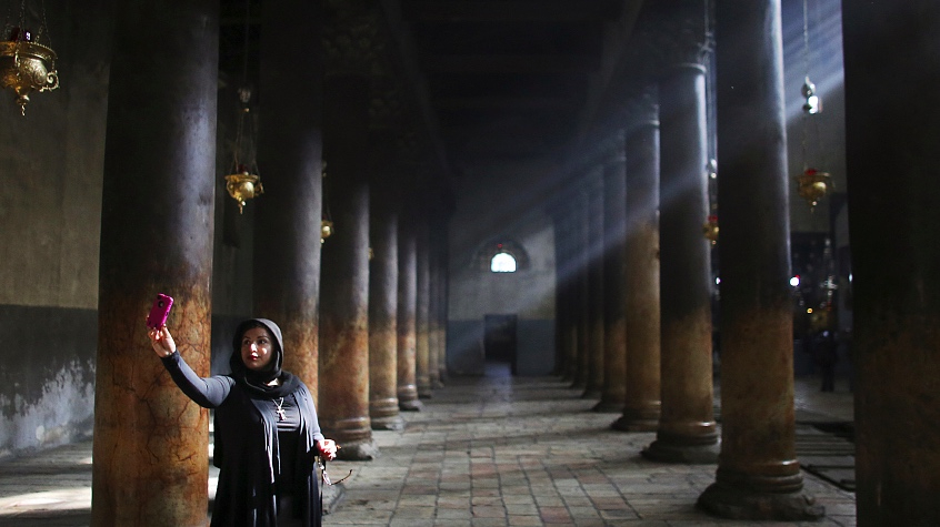 A visitor photographs herself inside the Church of Nativity in Bethlehem, December 23, 2012. /VCG Photo