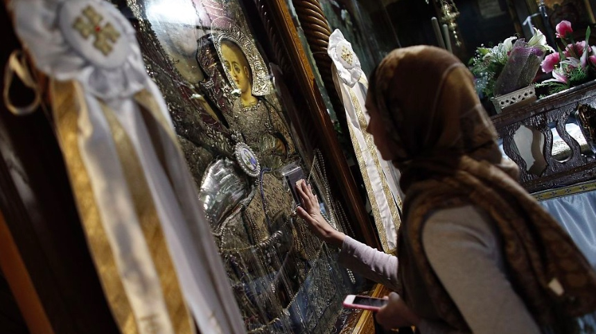 A Christian worshiper touches an icon at the Church of the Nativity in Bethlehem, December 18, 2014. /VCG Photo