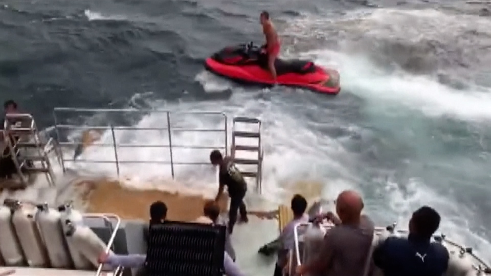 A Russian couple was caught stuck in a motorboat in the middle of the ocean during a massive storm. Fortunately, they spotted a passing tourist boat. The couple was offered fresh towels and beverages after being rescued, and the boat made it back safely to land.