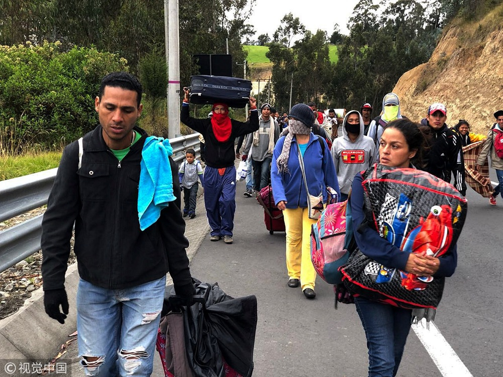 Venezuelan migrants walk along the Ecuadorean highway to Peru before new rules requiring they hold a valid passport kick in, at Tulcan, Ecuador, August 21, 2018. /VCG Photo