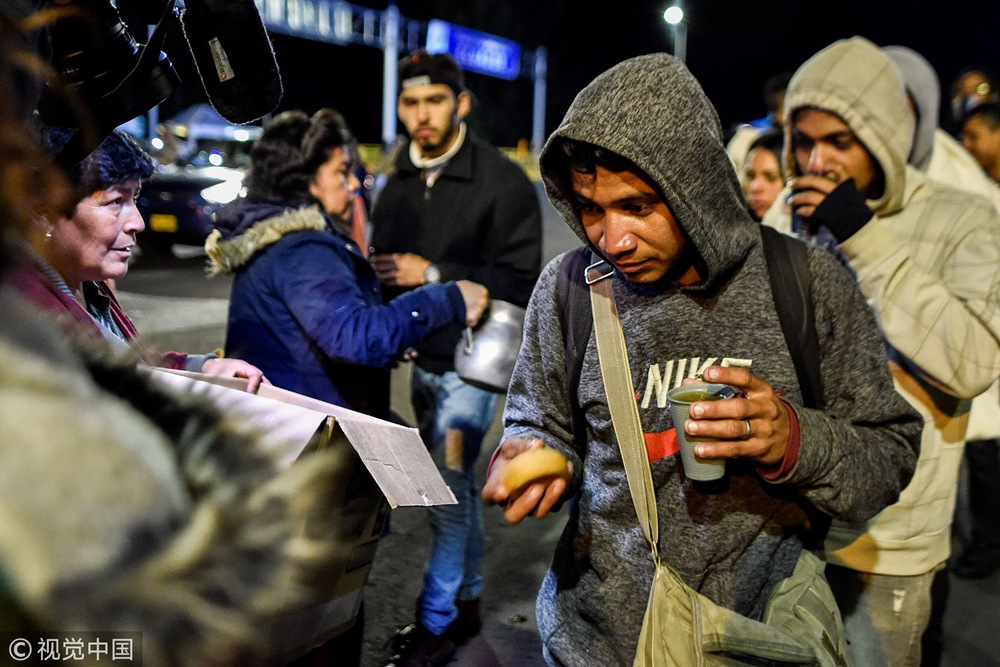 Venezuelan migrants waiting outside the Ecuadorean migration office at the Rumichaca international bridge in Tulcan, Ecuador, receive food from a group of Colombians who cross the border to help them, August 20, 2018. /VCG Photo