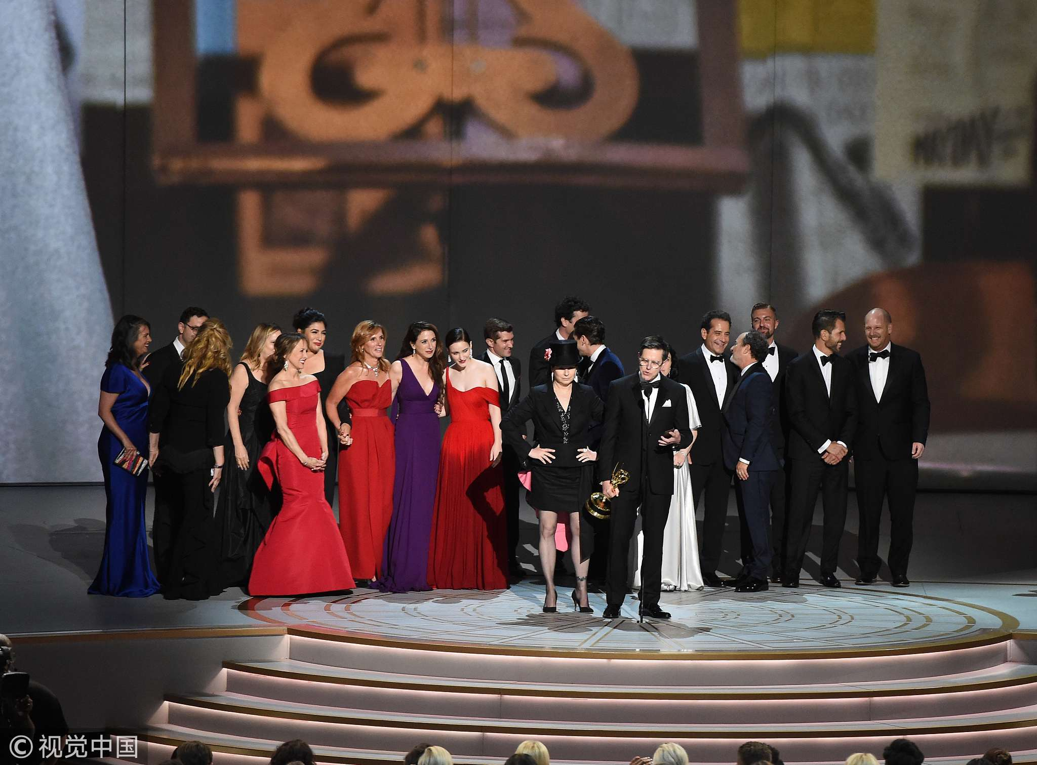 The cast and crew accepting the outstanding comedy series award for "The Marvelous Mrs. Maisel" /VCG Photo