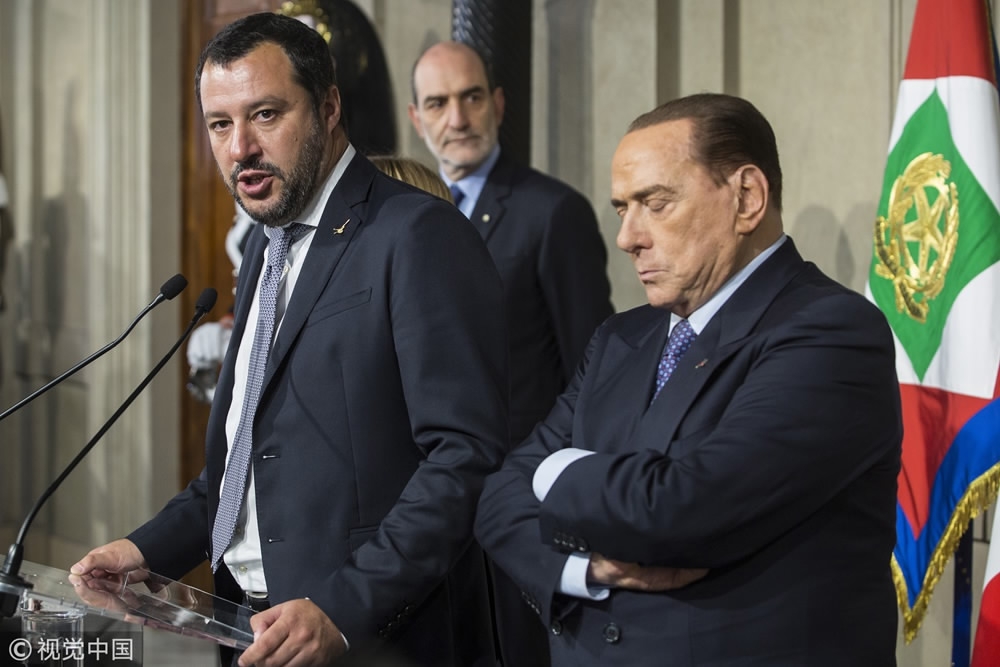 League leader Matteo Salvini (L) speaks as Forza Italia leader Silvio Berlusconi (R) looks on during a news conference at the Quirinal Palace in Rome, May 7, 2018. /VCG Photo