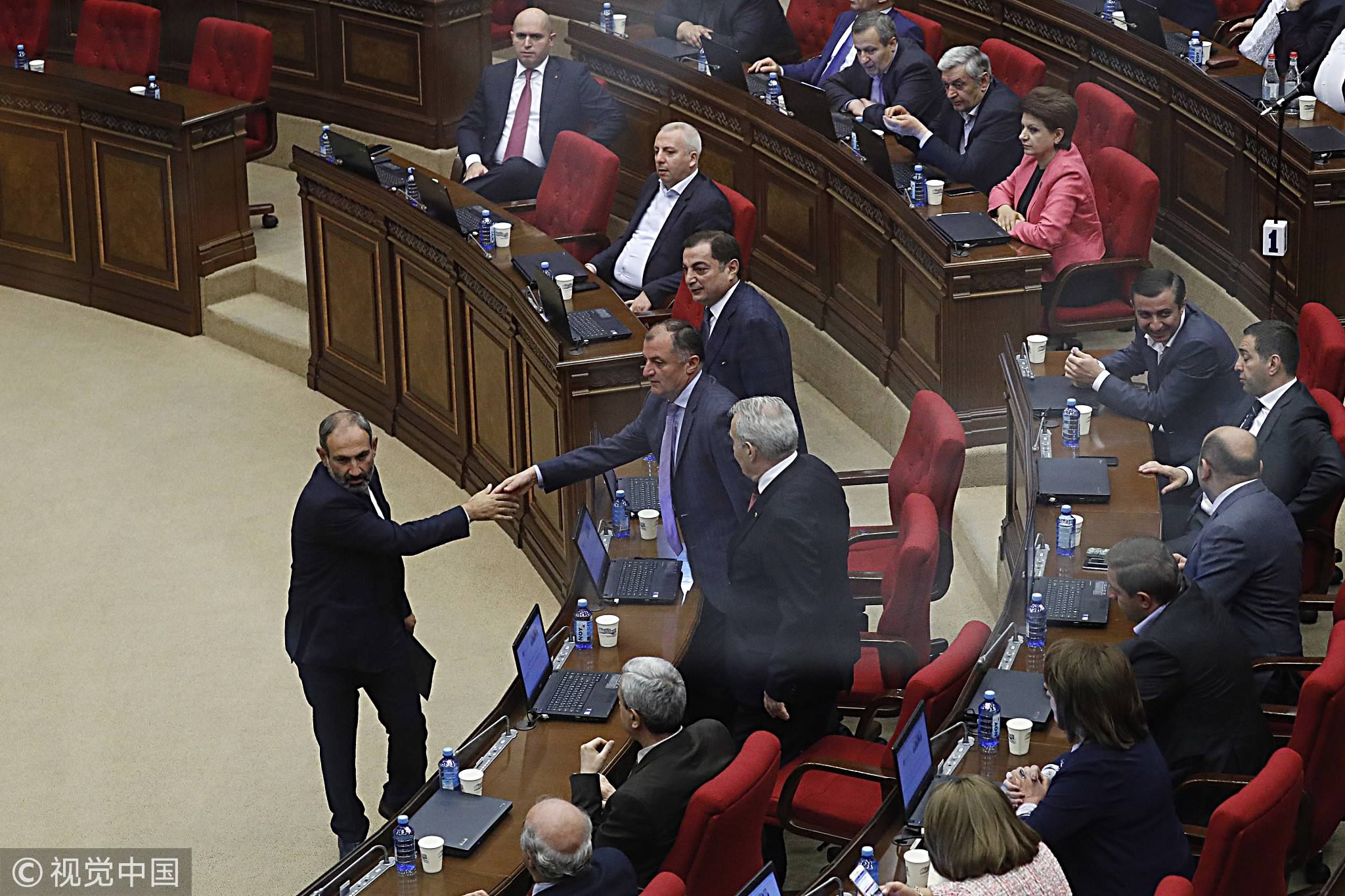 Nikol Pashinyan (L), leader of the 'Way Out' Alliance (Yelk) Party, attends a special meeting of the Armenian National Assembly to discuss electing Armenia's new Prime Minister, May 8, 2018. /VCG Photo