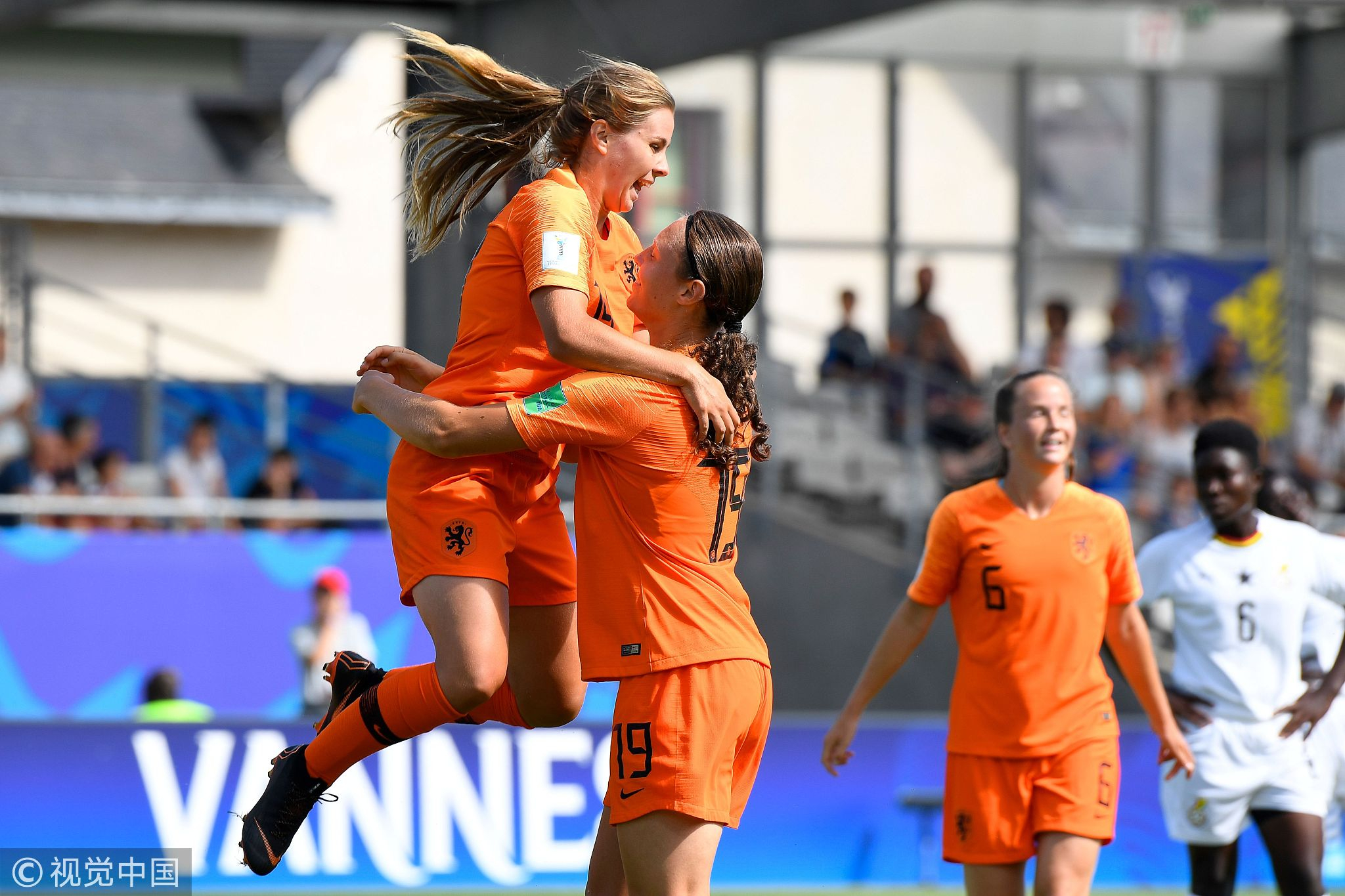 Netherlands' forward Fenna Kalma (C) is congratulated by midfielder Victoria Pelova after scoring a goal during the match between Netherlands and Ghana on August 8, 2018./VCG Photo