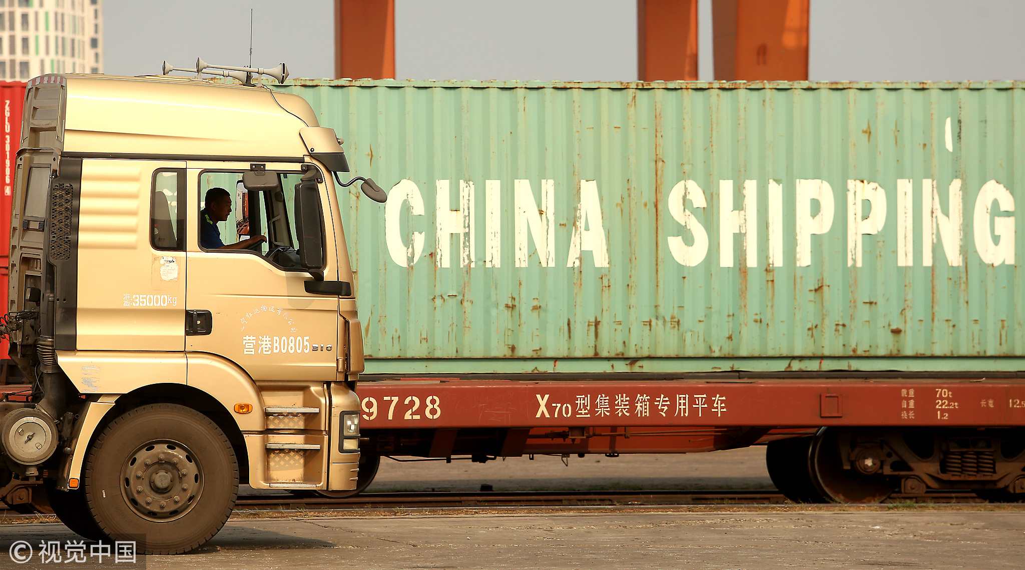 Chinese truck drivers transport cargo containers to a port in Yingkou, a major port city in Liaoning Province, July 18, 2018. /VCG Photo