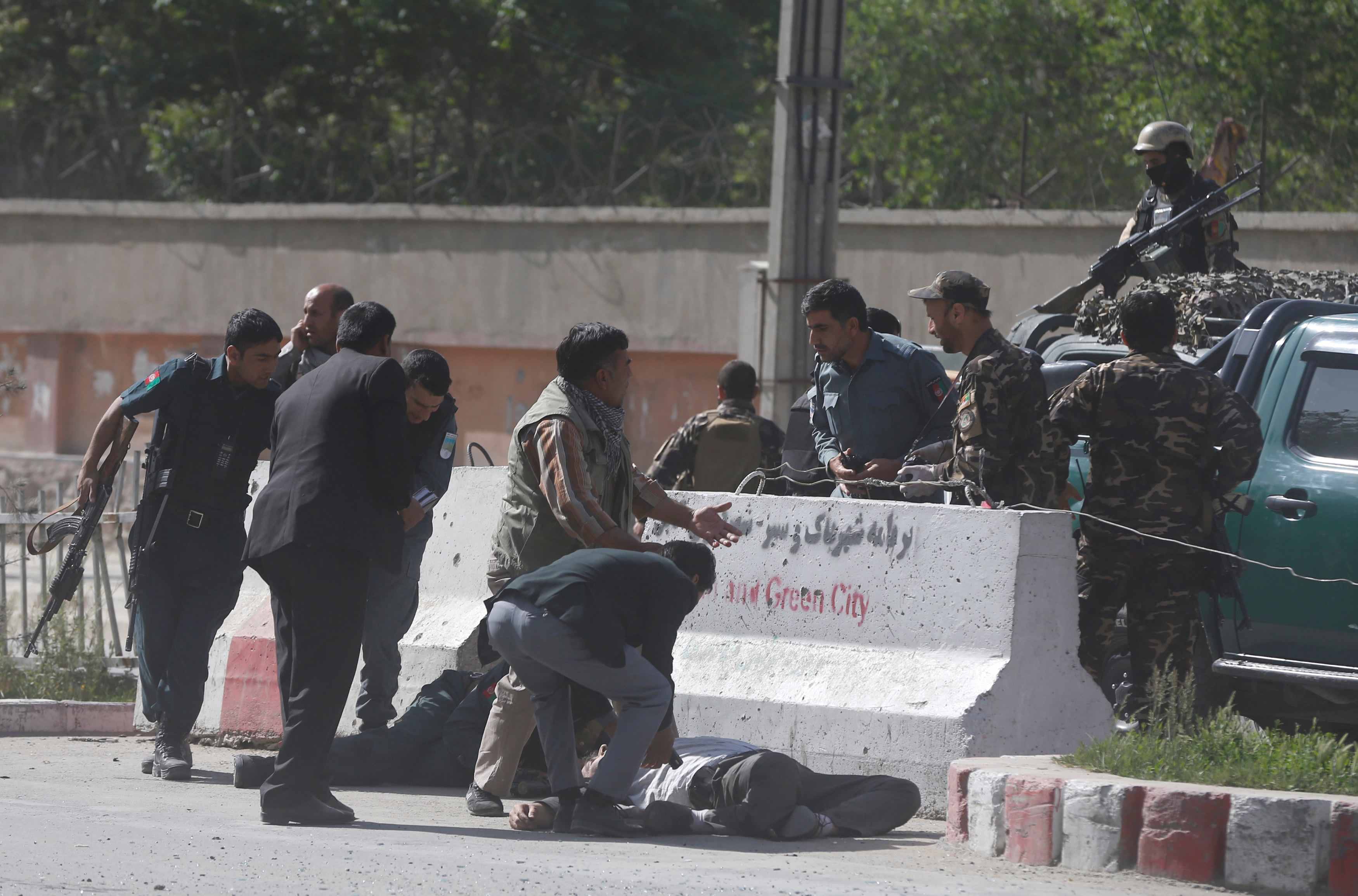 Policemen help Afghan journalists, victims of a second blast, in Kabul, Afghanistan, on April 30, 2018. /Reuters Photo