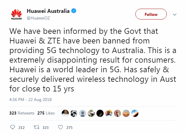 Huawei Australia's response to the government's ban /Screenshot of twitter