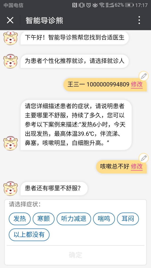 By sending a text or voice message to the intelligent system, patients can describe their symptoms, have their illness identified and find the department they should visit. They can also find a doctor by typing the doctor’s name.