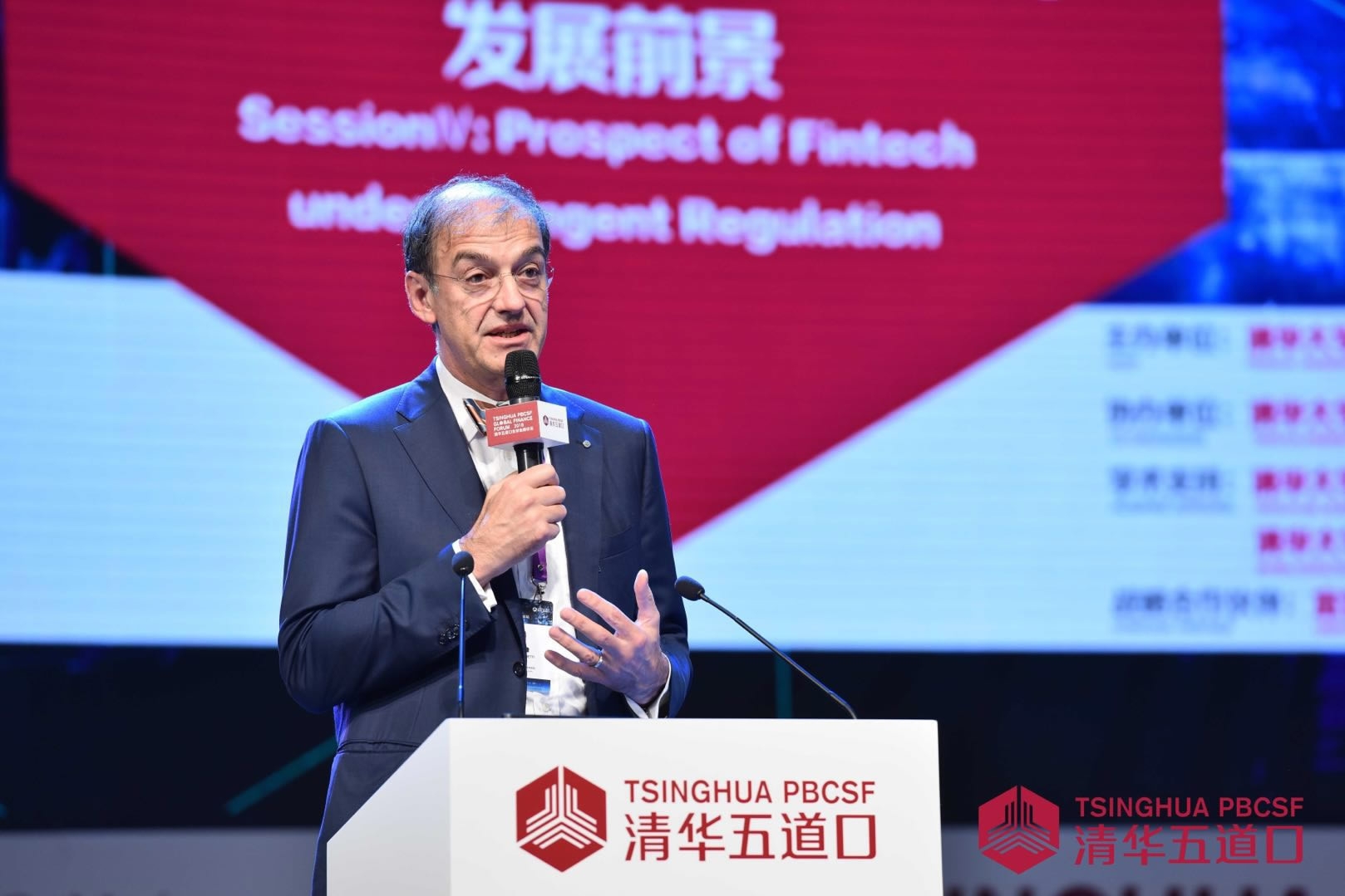 Luca Marighetti, head of tech transformation at Swiss Re, speaks at the 2018 Tsinghua PBCSF Global Financial Forum on Sunday, May 20, 2018. /Photo provided by Tsinghua PBCSF