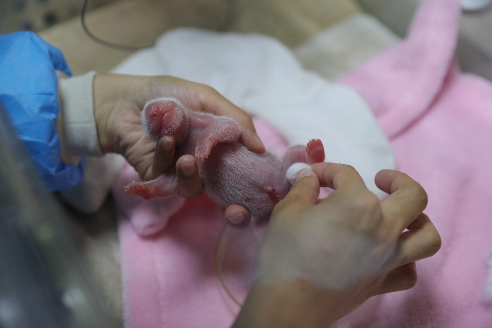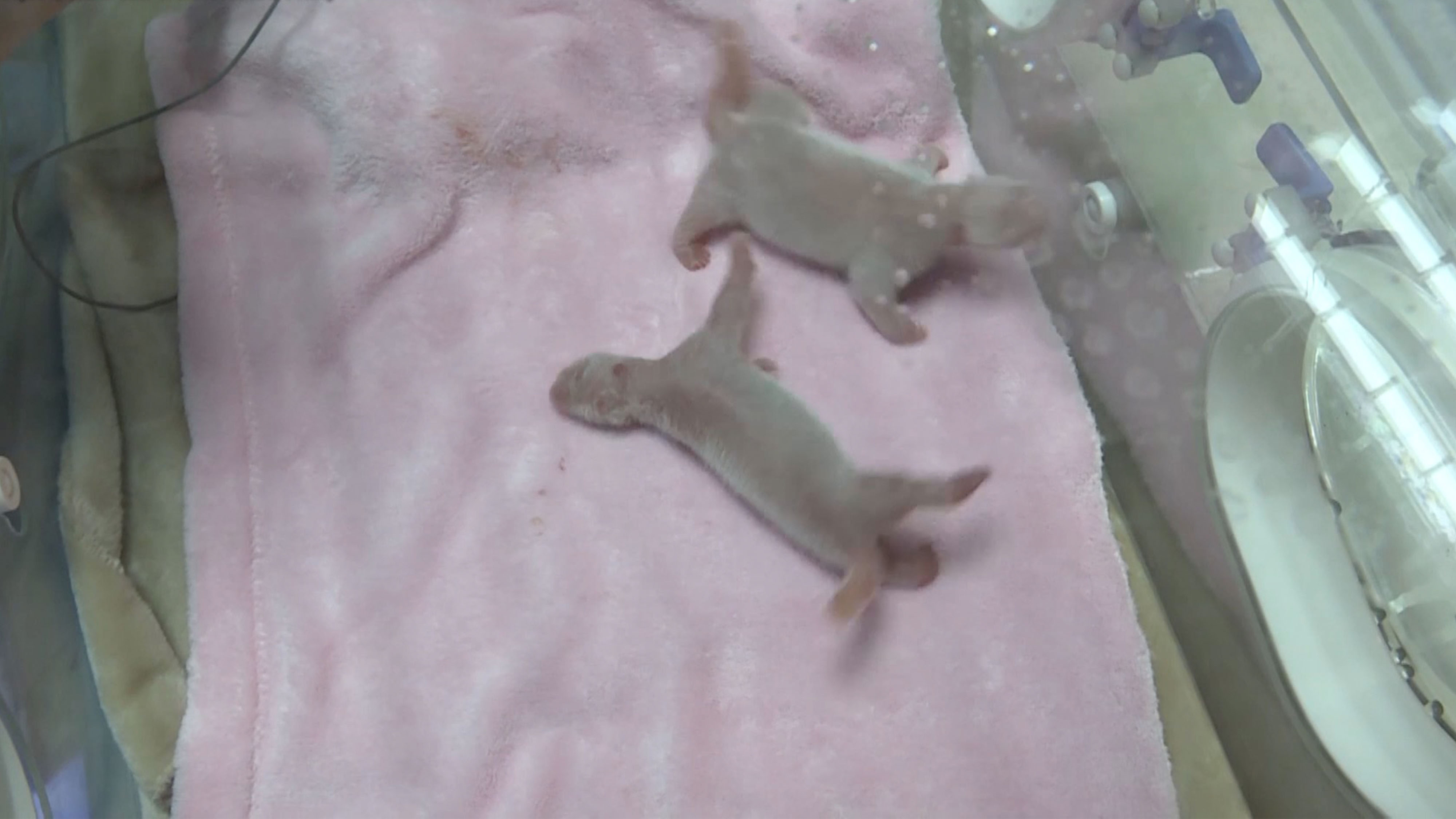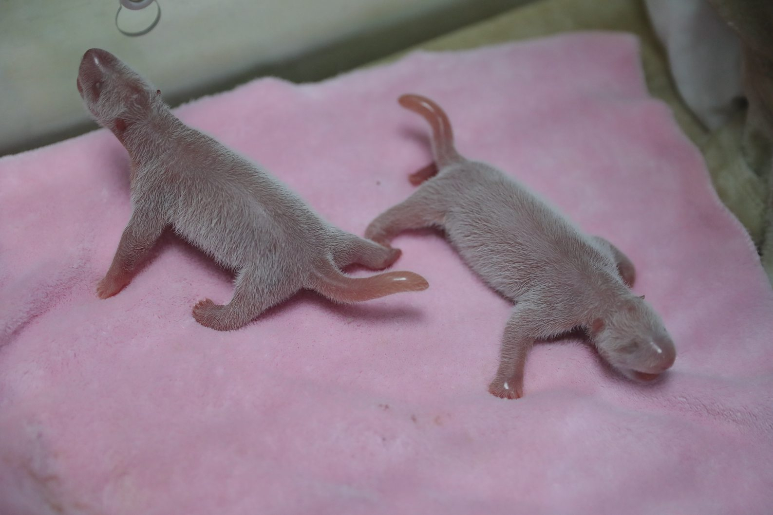 The female cub was born at 8:20 a.m. and weighs 135.3 grams, while her younger brother came nine minutes later and weighs 148.8 grams.