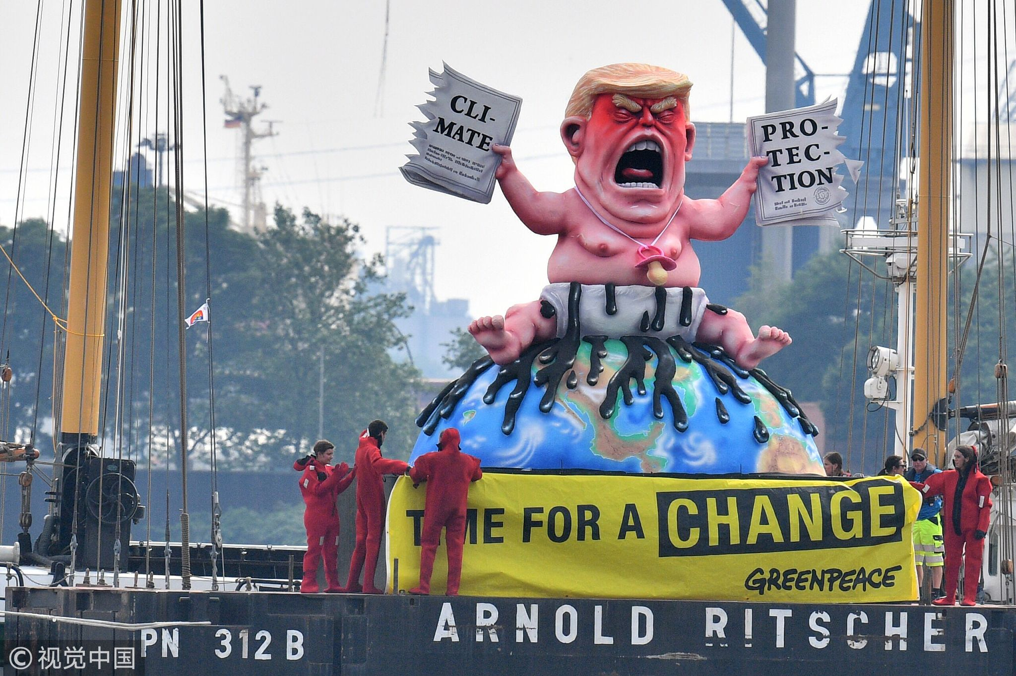 Greenpeace activists protest on a boat with a giant figure featuring US President Donald Trump as a baby, tearing up a climate protection document, on July 7, 2017, in Hamburg, northern Germany./ VCG Photo
