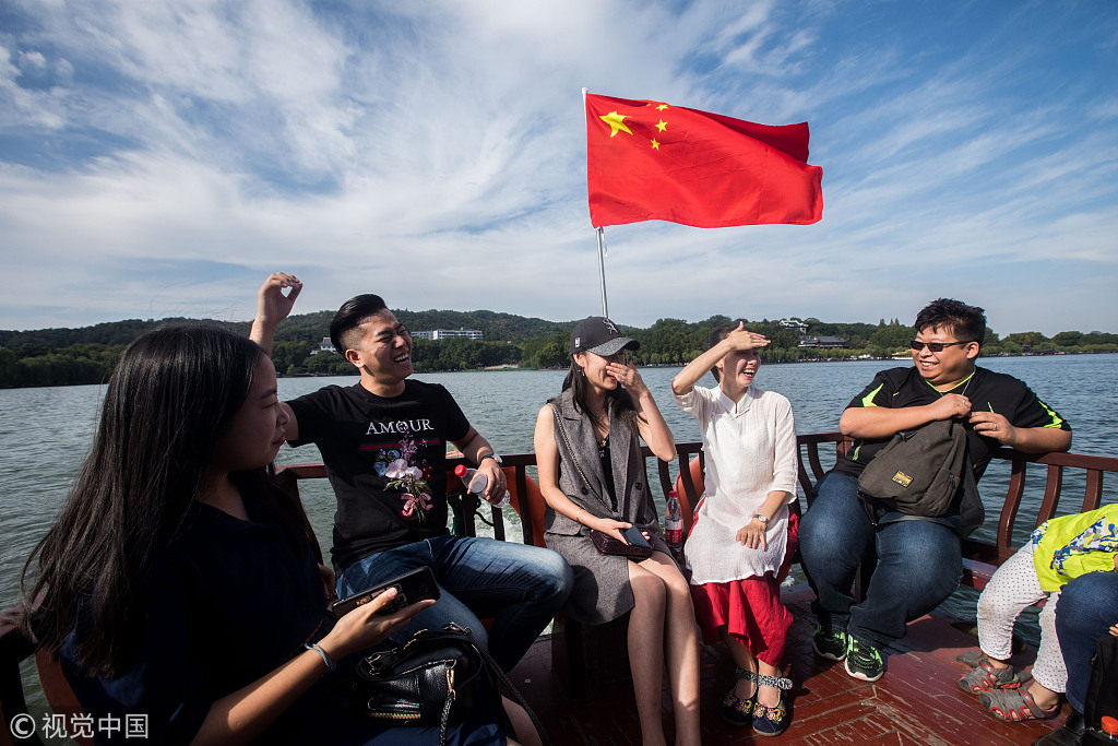 Hu Nana and visitors enjoy a trip by boat in Hangzhou, Zhejiang Province, China, Oct 1, 2018. /VCG Photo