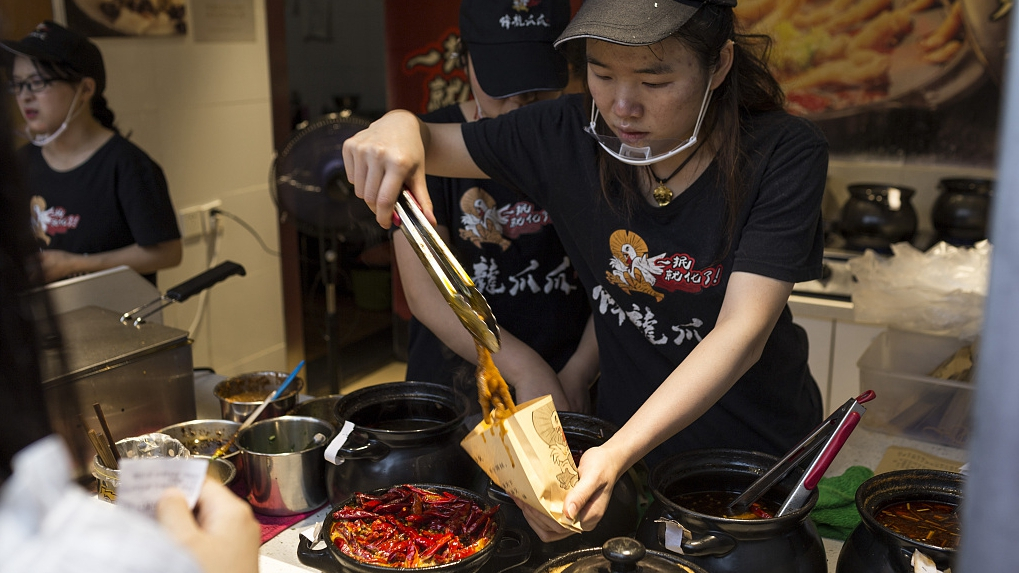 Tourists buy local snacks in Chengdu, southwest China's Sichuan Province, May 1, 2019. /VCG Photo