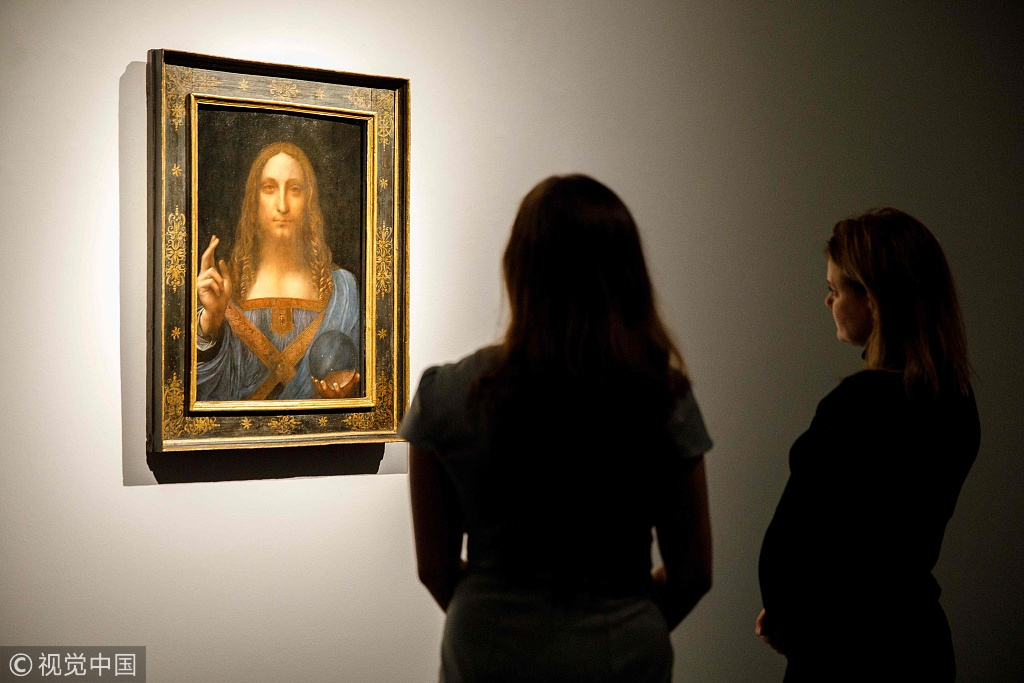 Christie's employees pose in front of a painting entitled Salvator Mundi by Italian polymath Leonardo da Vinci at a photocall at Christie's auction house in central London on October 22, 2017 ahead of its sale at Christie's New York on November 15, 2017. /VCG Photo