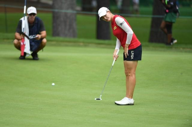 Ariya Jutanugarn lines up a putt on the sixth green during the second round of the US Women's Open Championship golf tournament at Shoal Creek.