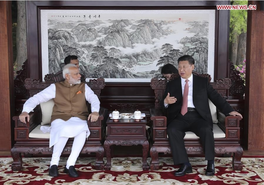 Chinese President Xi Jinping (R) talks with Indian Prime Minister Narendra Modi in Wuhan, capital of central China's Hubei Province, April 28, 2018. /Xinhua Photo.