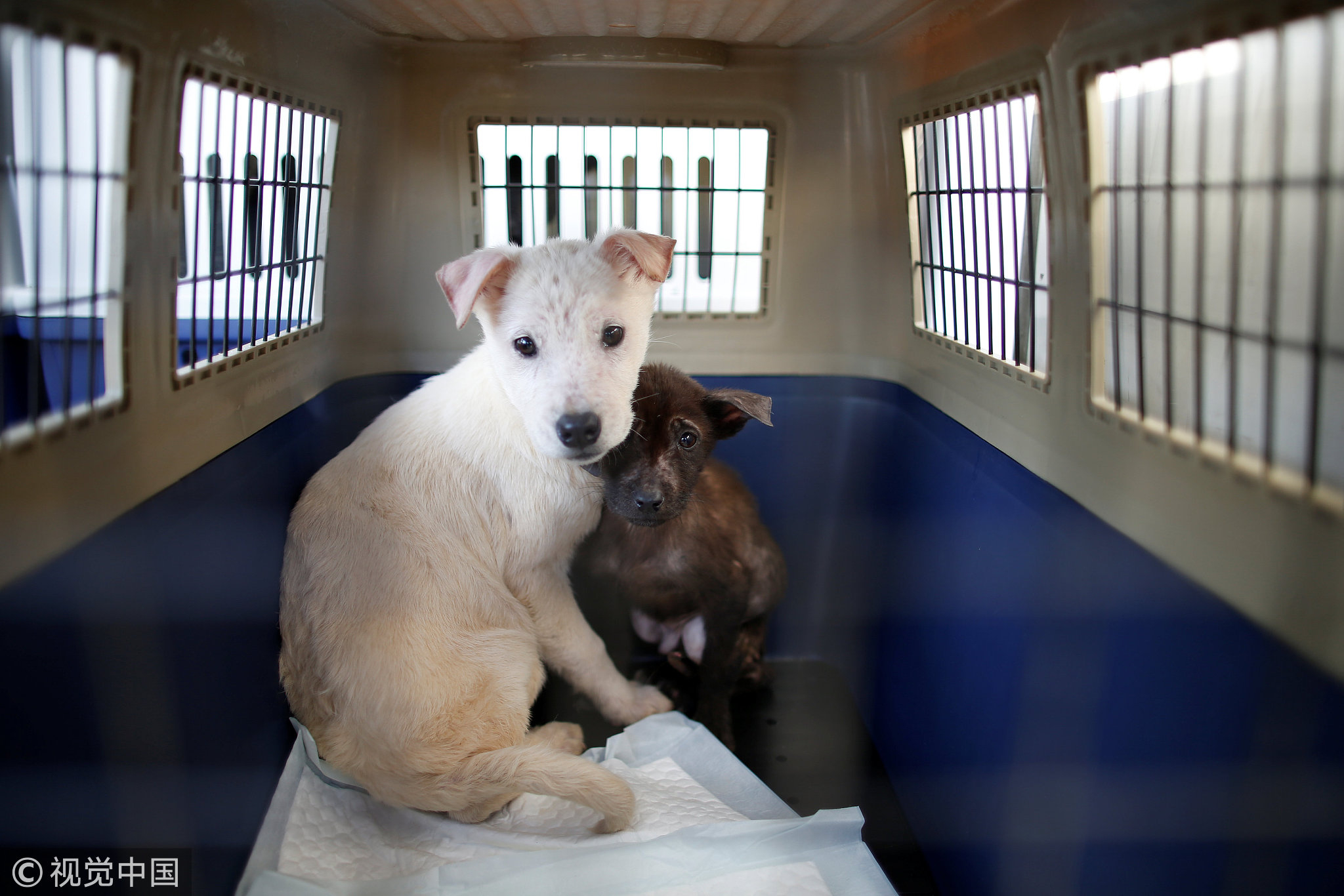 Rescued dogs are seen as they wait for transport at a dog meat farm in Wonju, South Korea, January 10, 2017. /VCG Photo