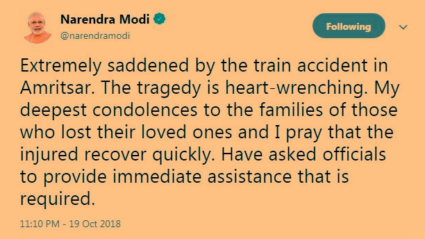 India's Prime Minister Narendra Modi took to Twitter to express his grief over the tragic accident. "Extremely saddened by the train accident in Amritsar. The tragedy is heart-wrenching. My deepest condolences to the families of those who lost their loved ones and I pray that the injured recover quickly. Have asked officials to provide immediate assistance that is required," he wrote.