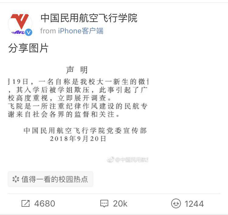 The university's announcement to investigate the claim was commented on over 20,000 times on Weibo. /Screenshot via Weibo