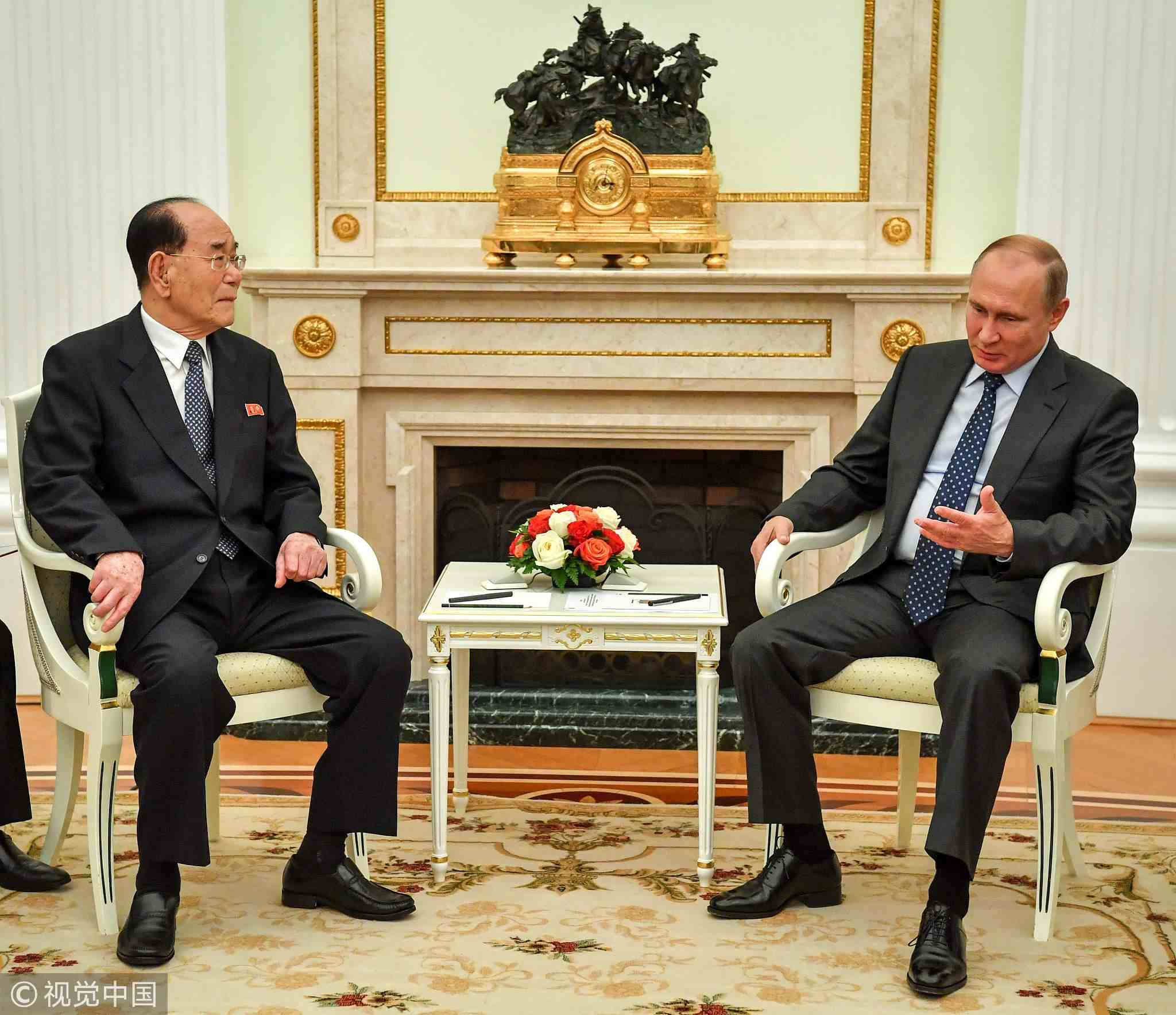 Russian President Vladimir Putin (R) confers with Kim Yong Nam, the president of the Presidium of the Supreme People's Assembly of the DPRK, at the Kremlin in Moscow, June 14, 2018. /VCG Photo