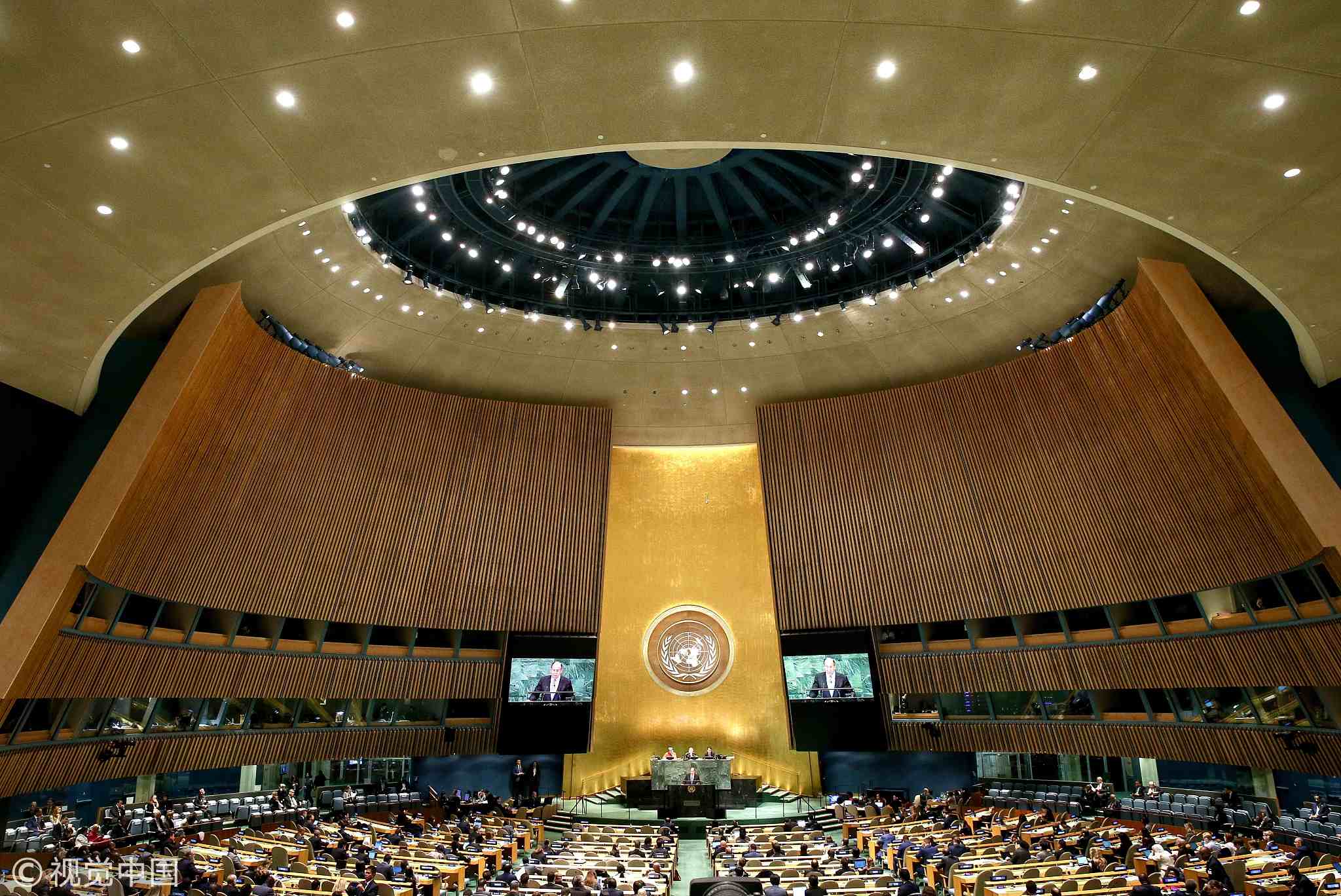 Russia's Foreign Minister Sergei Lavrov (C) addresses the 73rd session of the United Nations General Assembly at the UN headquarters, September 28, 2018. /VCG Photo