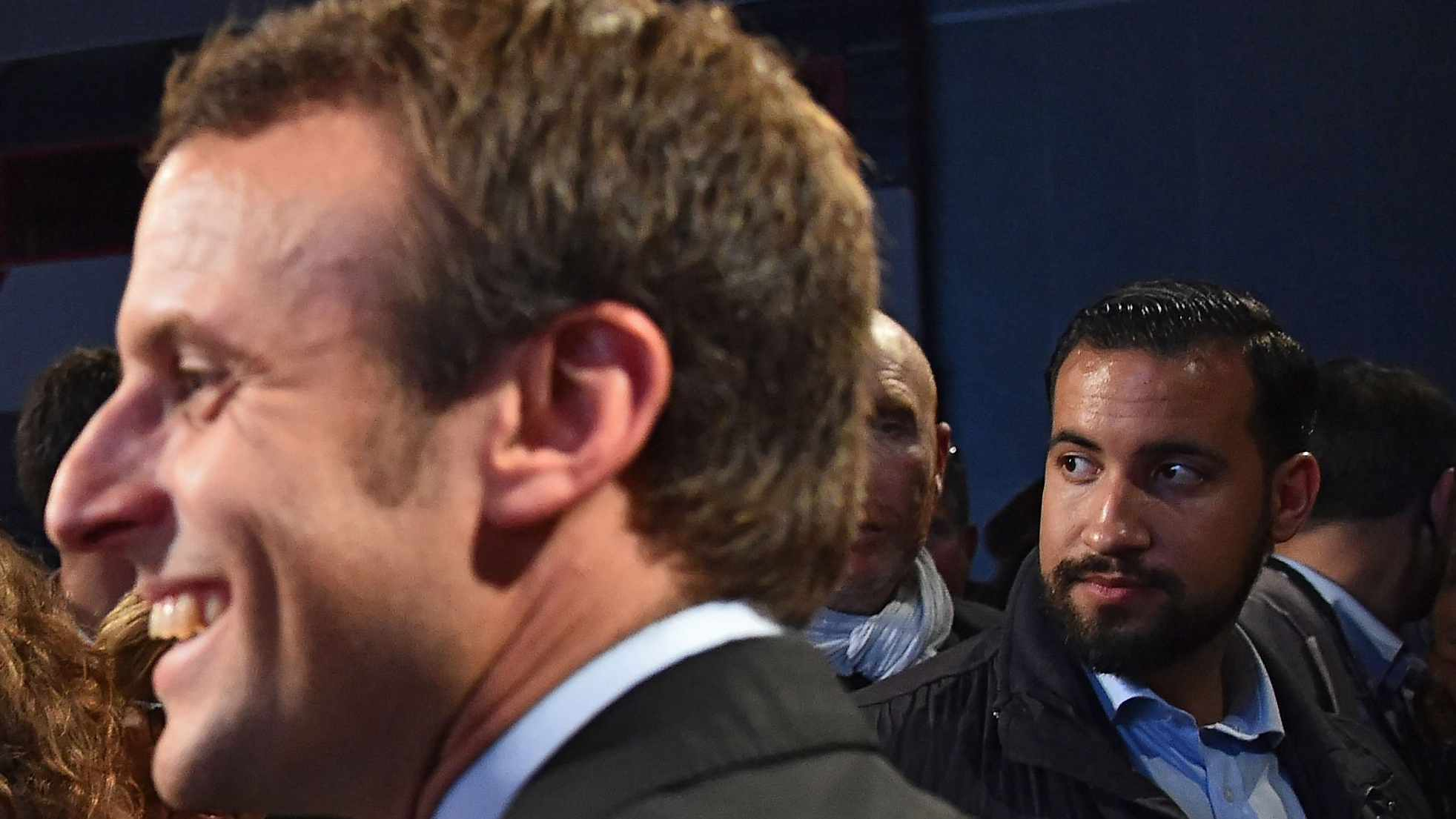 and candidate for the 2017 presidential election, flanked by Alexandre Benalla