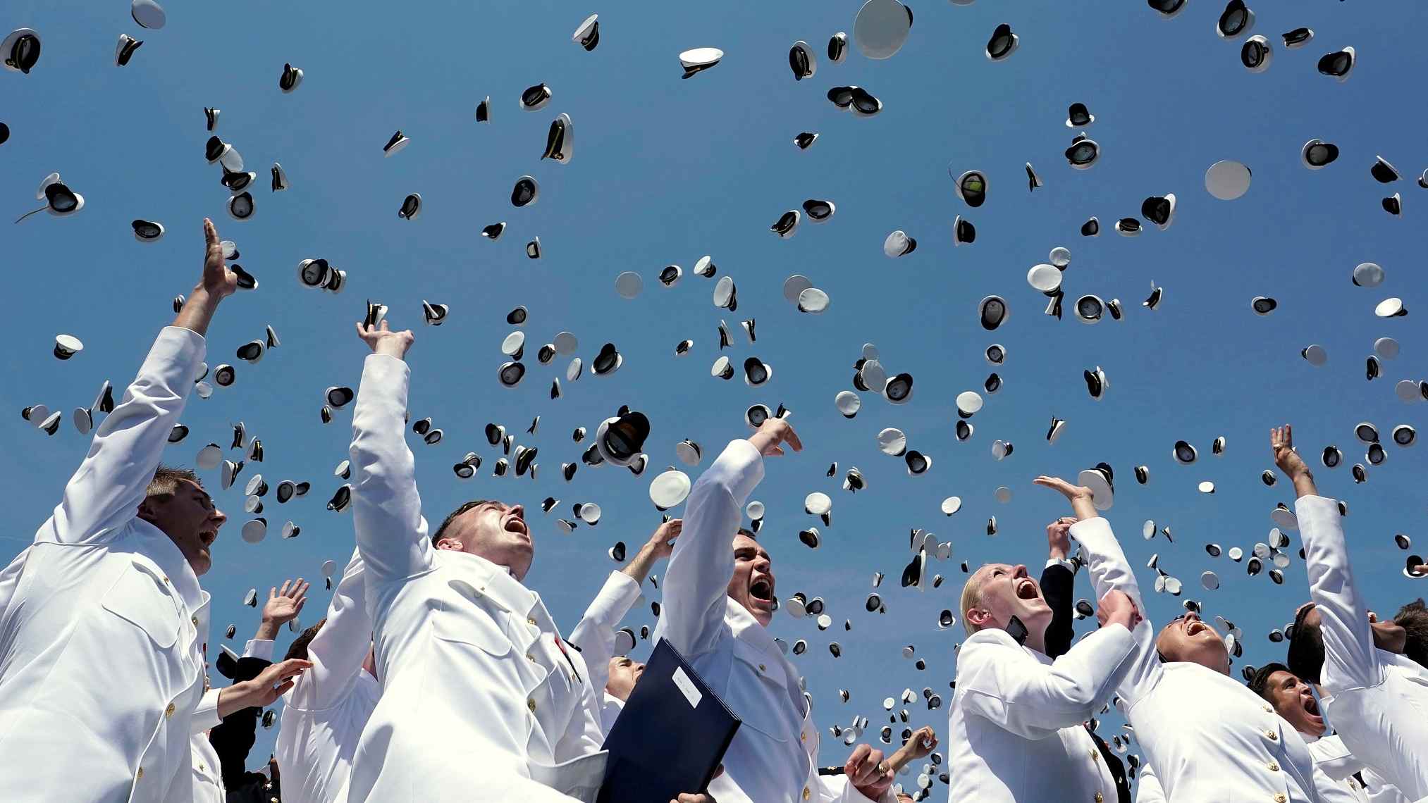 1042 graduating midshipmen from the US Naval Academy (USNA) tossed their caps into the air upon the conclusion of the commissioning and graduation ceremony inside Navy-Marine Corps Memorial Stadium in Annapolis, Maryland, May 25, 2018. /VCG Photo