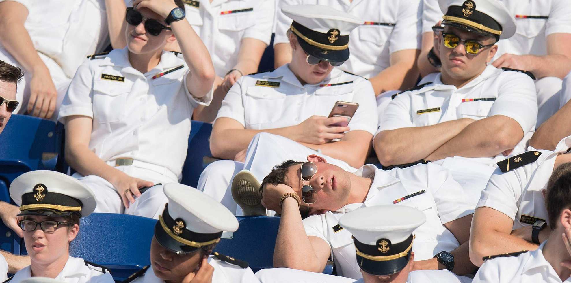 In the three hours spent under a cloudless sky, underclassmen of the USNA, who were required to attend the ceremony, tried to find a moment to sneak in a quick snooze. /VCG Photo