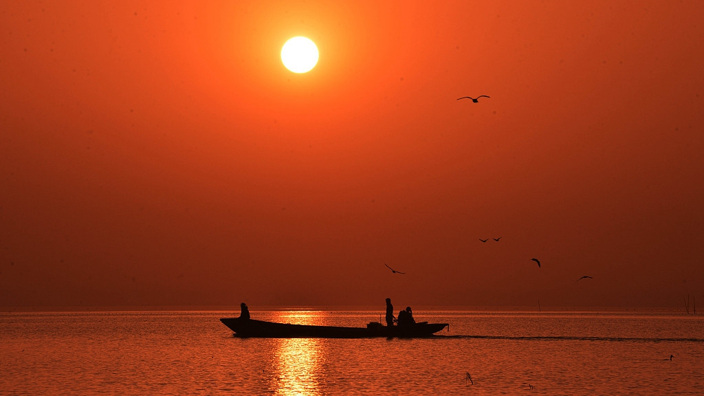A boat with passengers on Bosten Lake during sunset. /VCG Photo