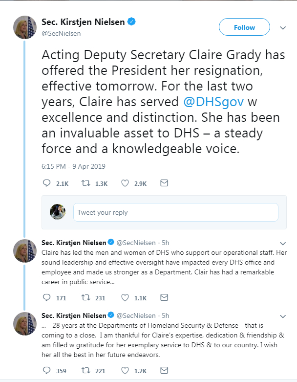 Nielsen praised Grady as an "invaluable asset" and "a steady force" at the DHS in her tweet.