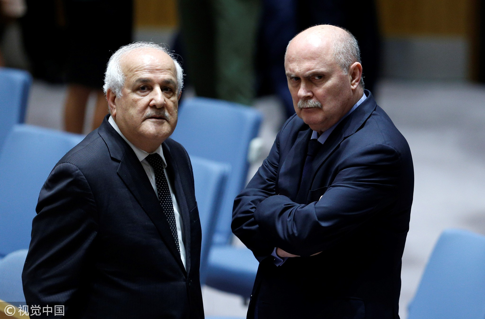 Palestinian Ambassador to the United Nations Riyad Mansour (L) stands with Permanent Representative of Turkey to the United Nations Feridun Sinirlioglu before a Security Council meeting on the situation in the Middle East including the Question of Palestine at the United Nations Headquarters in New York, United States, June 01, 2018. /VCG Photo