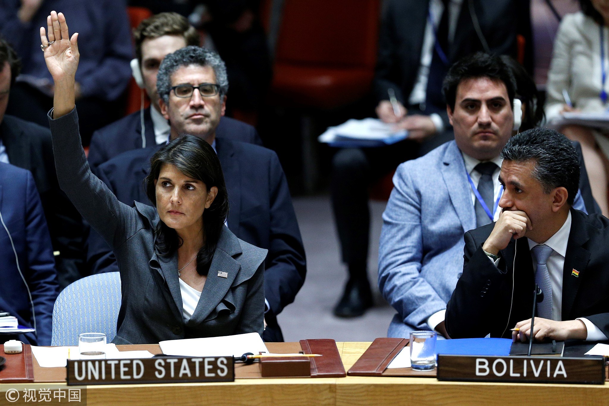 United States Ambassador to the United Nations, Nikki Haley (L) votes during the Security Council meeting on the situation in the Middle East including the Question of Palestine at the United Nations Headquarters in New York, United States, June 01, 2018. /VCG Photo