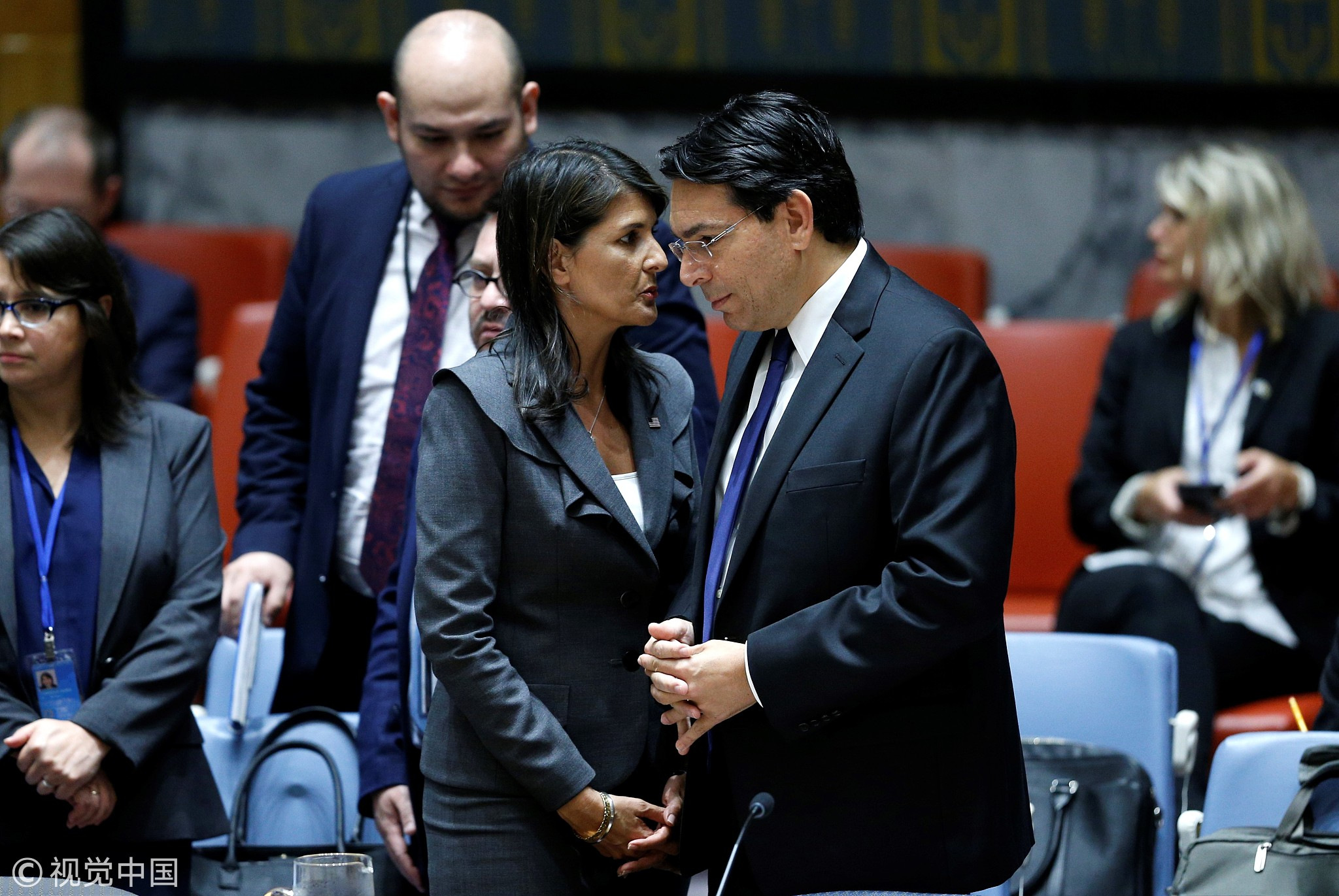United States Ambassador to the United Nations, Nikki Haley (C-L) speaks with Permanent Representative of Israel to the United Nations Danny Danon (C-R) before Security Council meeting on the situation in the Middle East including the Question of Palestine at the United Nations Headquarters in New York, United States on June 01, 2018. /VCG Photo