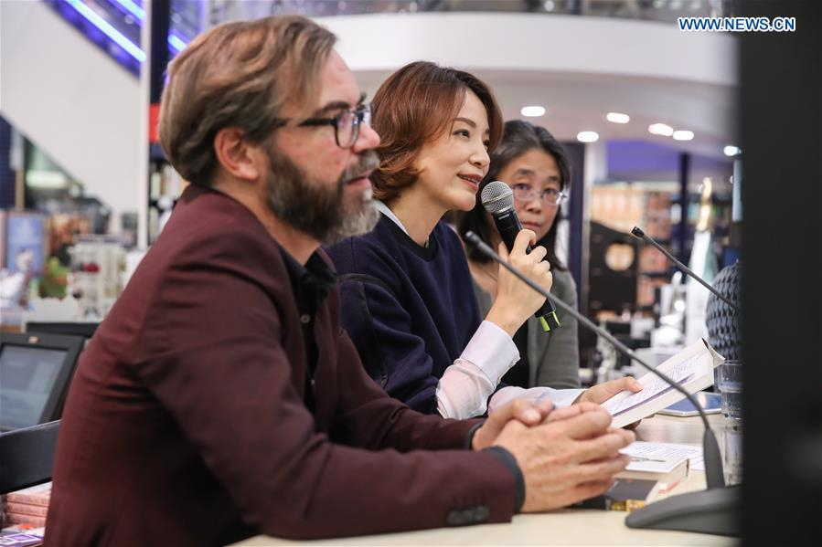 Dong Qing (C), renowned Chinese anchorwoman, the producer of the program "Readers" as well as the chief editor of the book "Readers", and German writer David Wagner, attend a book reading at a Thalia bookstore, Berlin, Germany, October 11, 2018. /Xinhua Photo