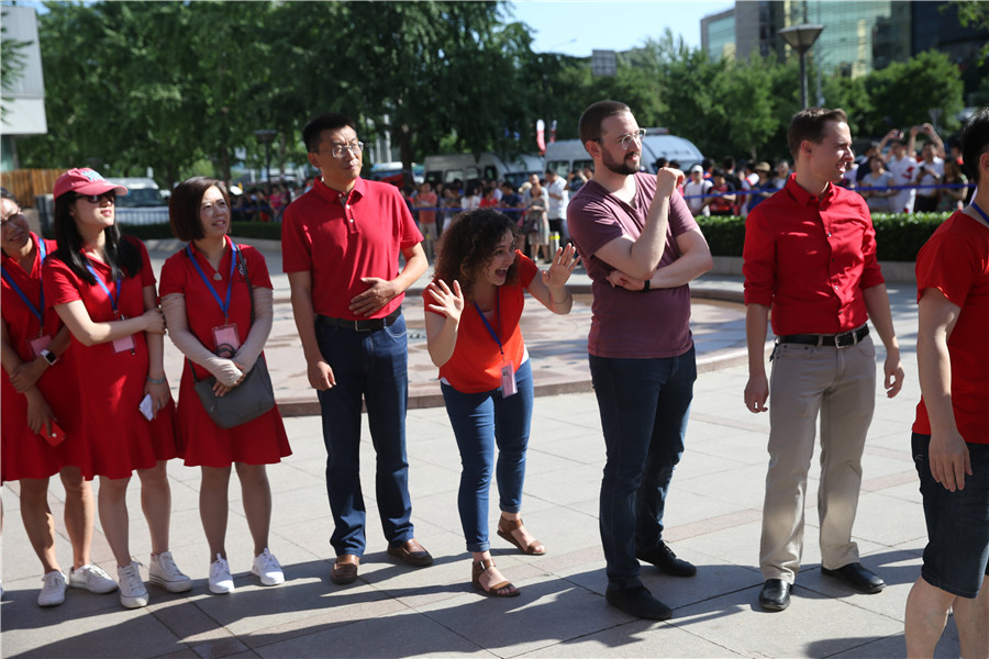 A group of foreign teachers cheer for candidates before they enter an exam site in Beijing, China, June 7, 2018. /Photo via China Daily