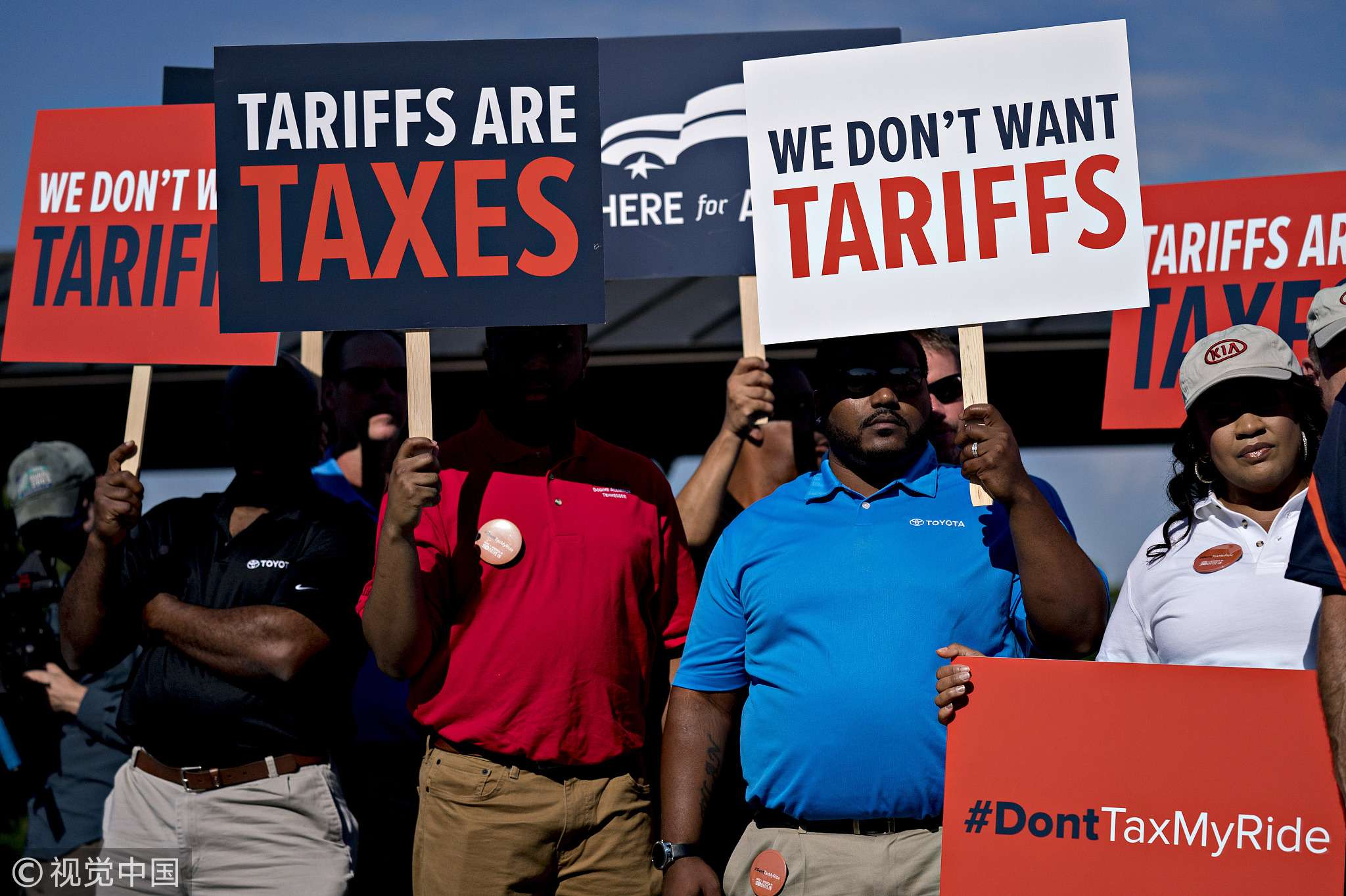 Autoworkers hold signs opposed to auto tariffs during a news conference on Capitol Hill in Washington on Thursday, July 19, 2018. /VCG Photo