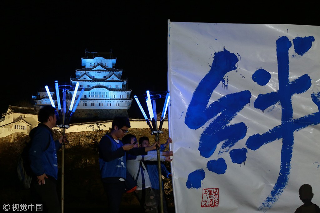 Japanese people hold LED light torches as they hold a banner with "Kizuna, Bond" on it and stand in front of the World Heritage Himeji Castle illuminated in blue light to mark World Autism Awareness Day in Himeji, Japan, April 2, 2018. /VCG Photo