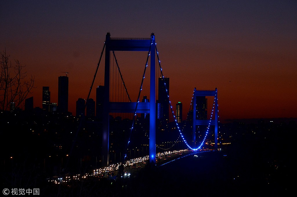 Fatih Sultan Mehmet Bridge light-up blue for the World Autism Awareness Day in Istanbul, Turkey, April 2, 2018. /VCG Photo