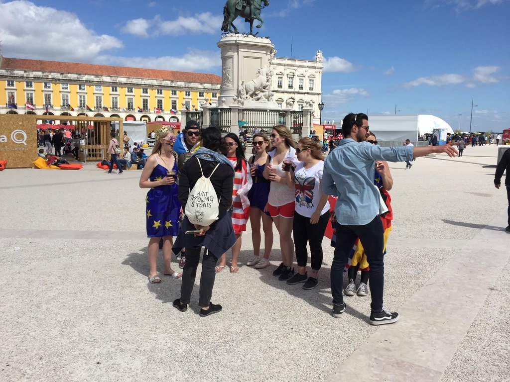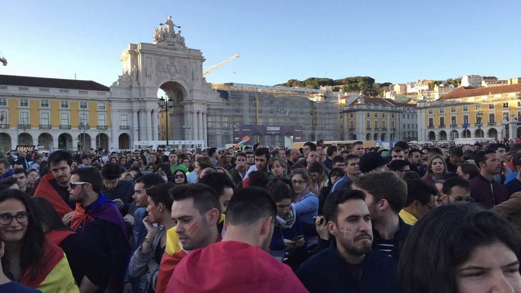 Instead, we were with thousands of Portuguese and international fans crowded into the “Eurovision Village” in a massive ornate old square in downtown Lisbon. Giant screens showed the performances just like you’d see them on TV across Europe, or via live streaming around the world.