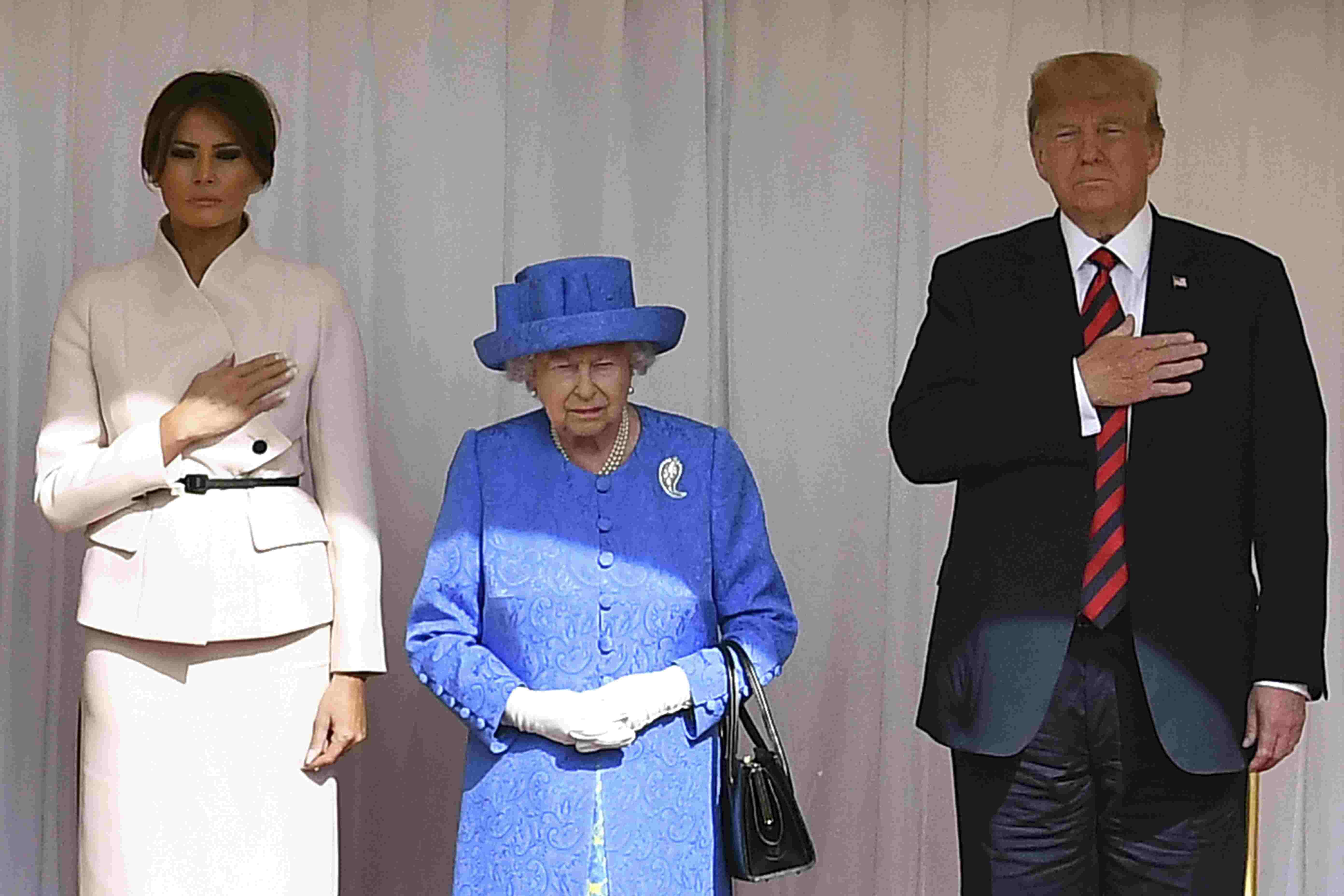 The Queen stands with US President Donald Trump and first lady Melania as they listen to a band of guardsmen playing the US national anthem during a welcome ceremony at Windsor Castle on Friday. /AP Photo