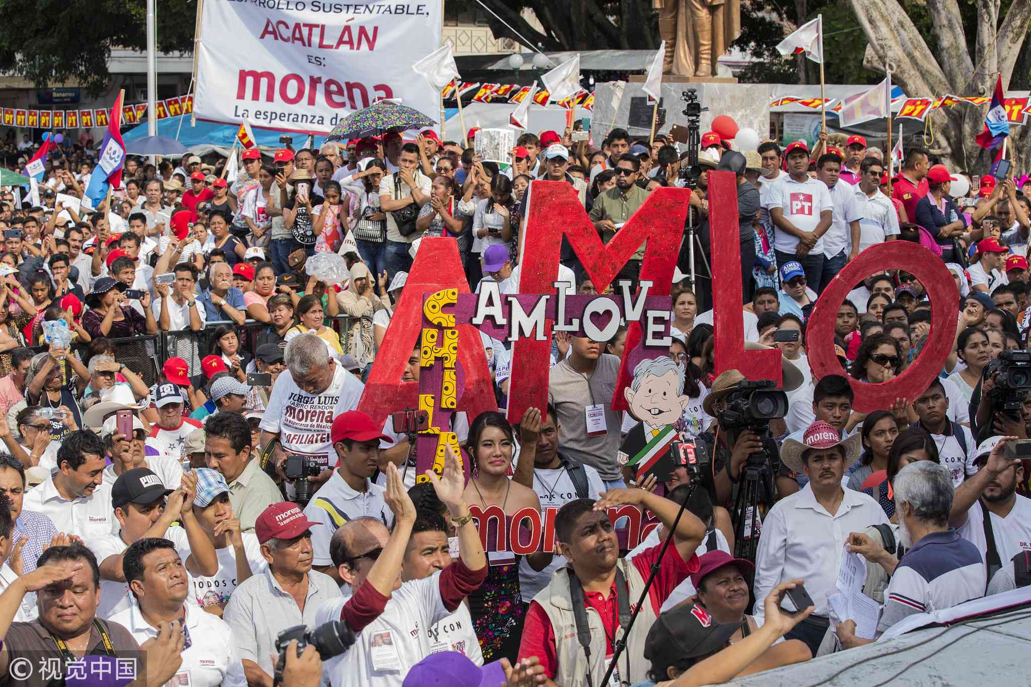 Supporters hold signs while Andres Manuel Lopez Obrador, presidential candidate of the National Regeneration Movement Party, (not pictured) speaks during a campaign rally in the town of Chilapa, near Chilpancingo, Guerrero state, June 7, 2018. /VCG Photo