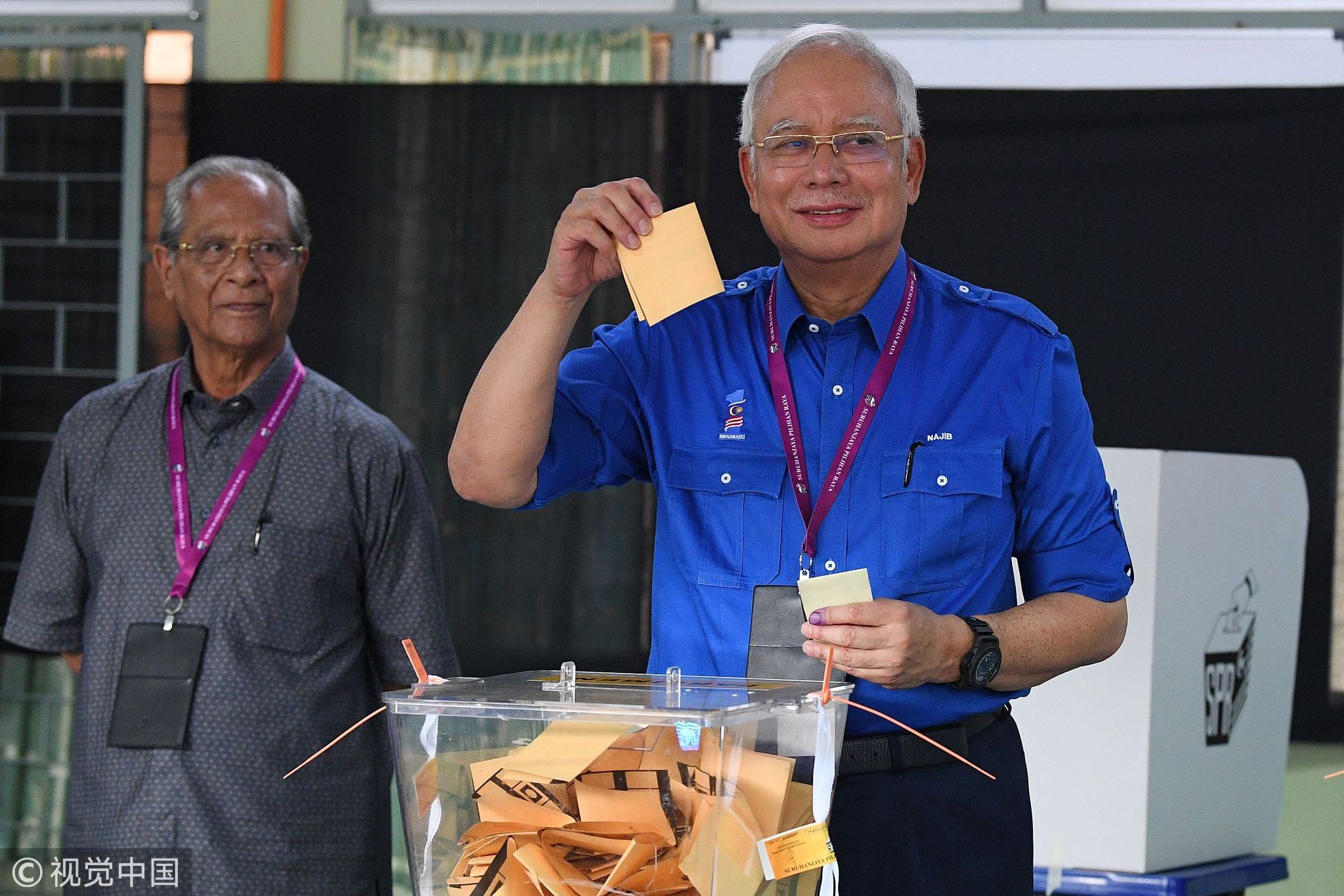 Former Malaysian prime minister Najib votes at a polling station during the 14th general elections in Pekan, May 9, 2018. /VCG Photo