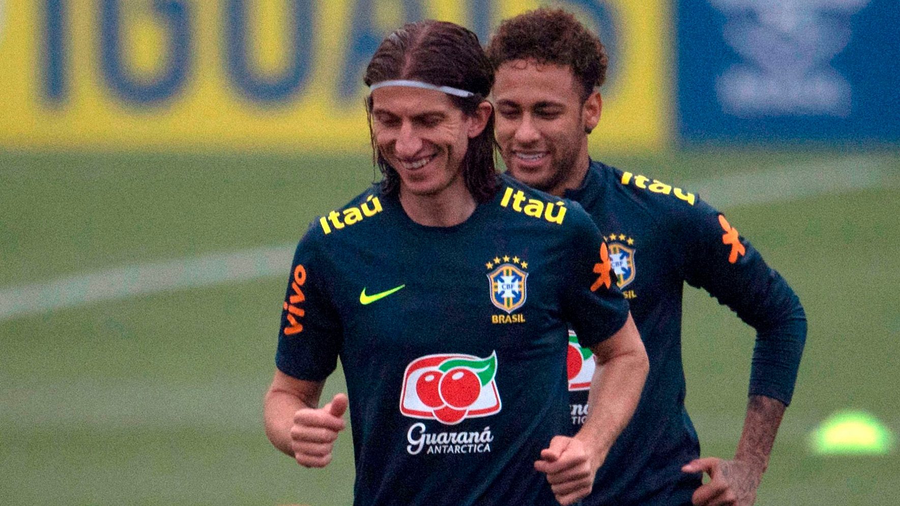 Brazil's players Neymar (R) and Filipe Luis attend a training session of the national football team ahead of FIFA's 2018 World Cup, at Granja Comary training centre in Teresopolis, Rio de Janeiro, Brazil, on May 23. /VCG Photo