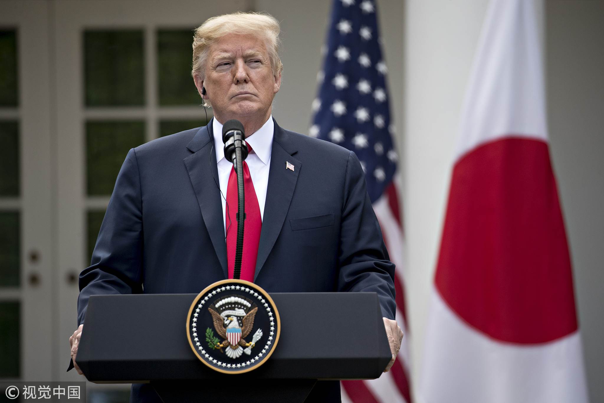 Trump listens as Shinzo Abe speaks during a news conference in the Rose Garden of the White House, June 7, 2018. /VCG Photo