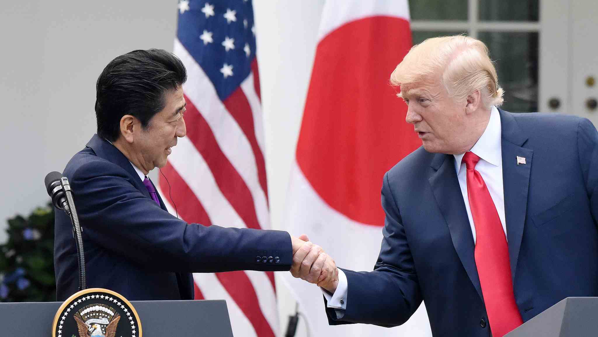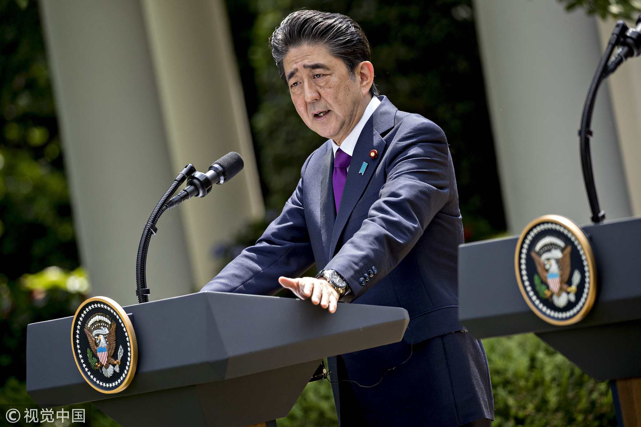 Abe speaks during a news conference with Trump in the Rose Garden of the White House, June 7, 2018. /VCG Photo
