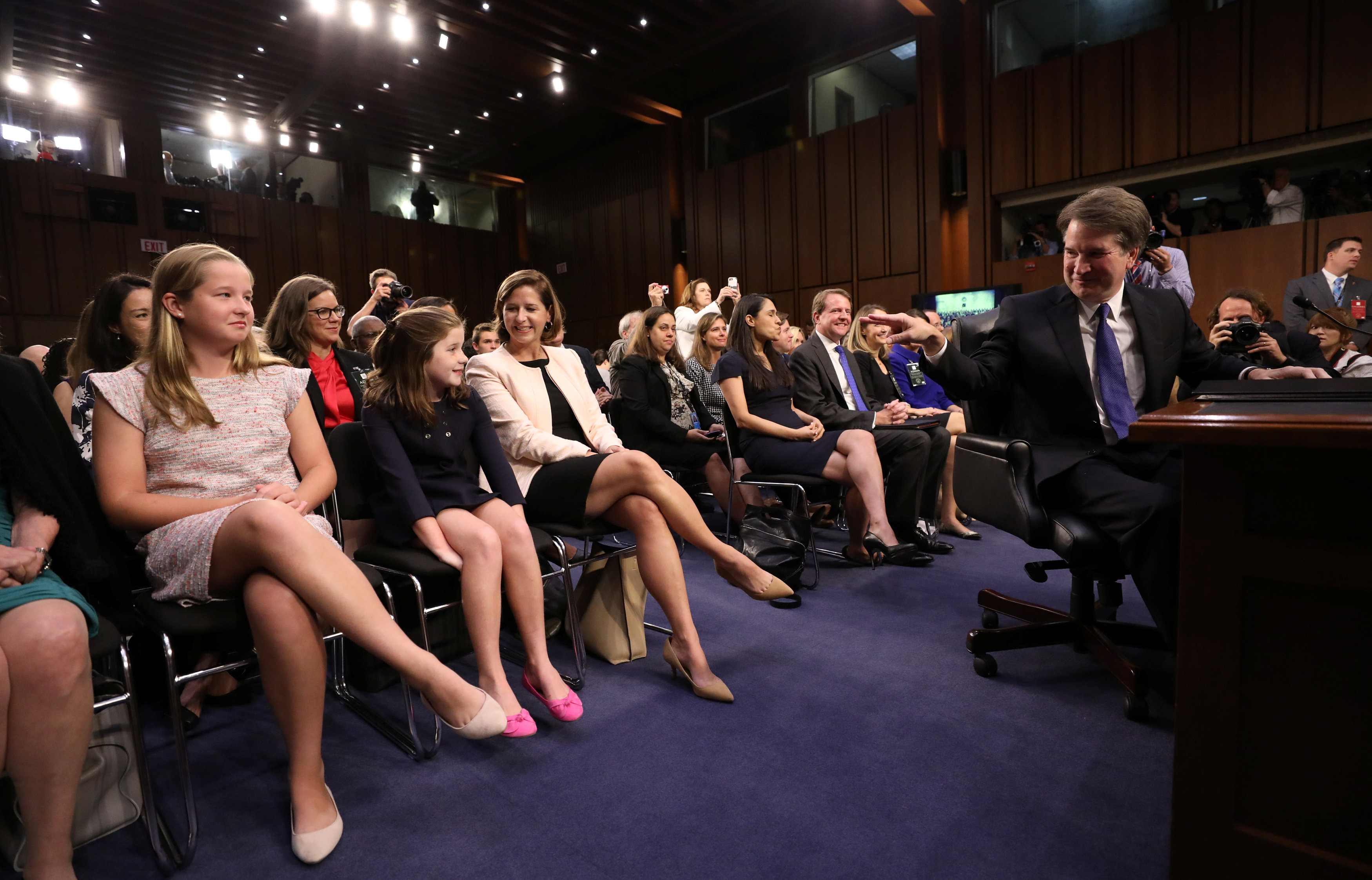 US Supreme Court nominee judge Brett Kavanaugh points to his daughters before the start of his Senate Judiciary Committee